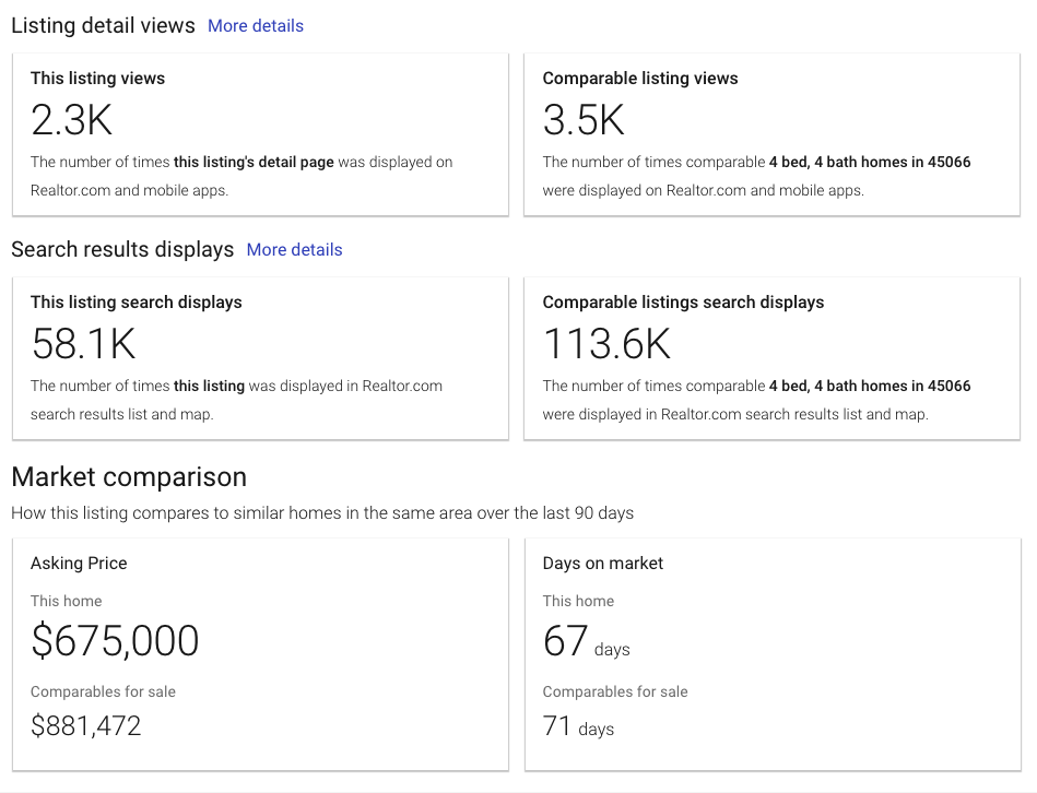 To view more details, scroll down and select “Listing Report”. Here you can change the time frame in which you see the listing performance, as well as view the data on comparable listings.